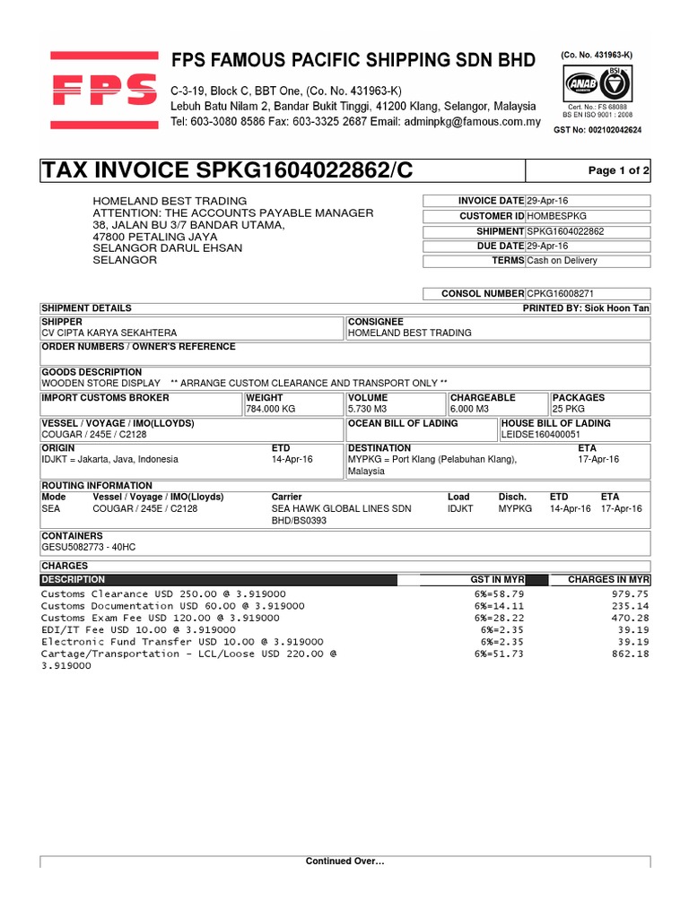 Tax Invoice Spkg1604022862 C Hombespkg 29 Apr 16 Pdf Cargo Bill Of Lading